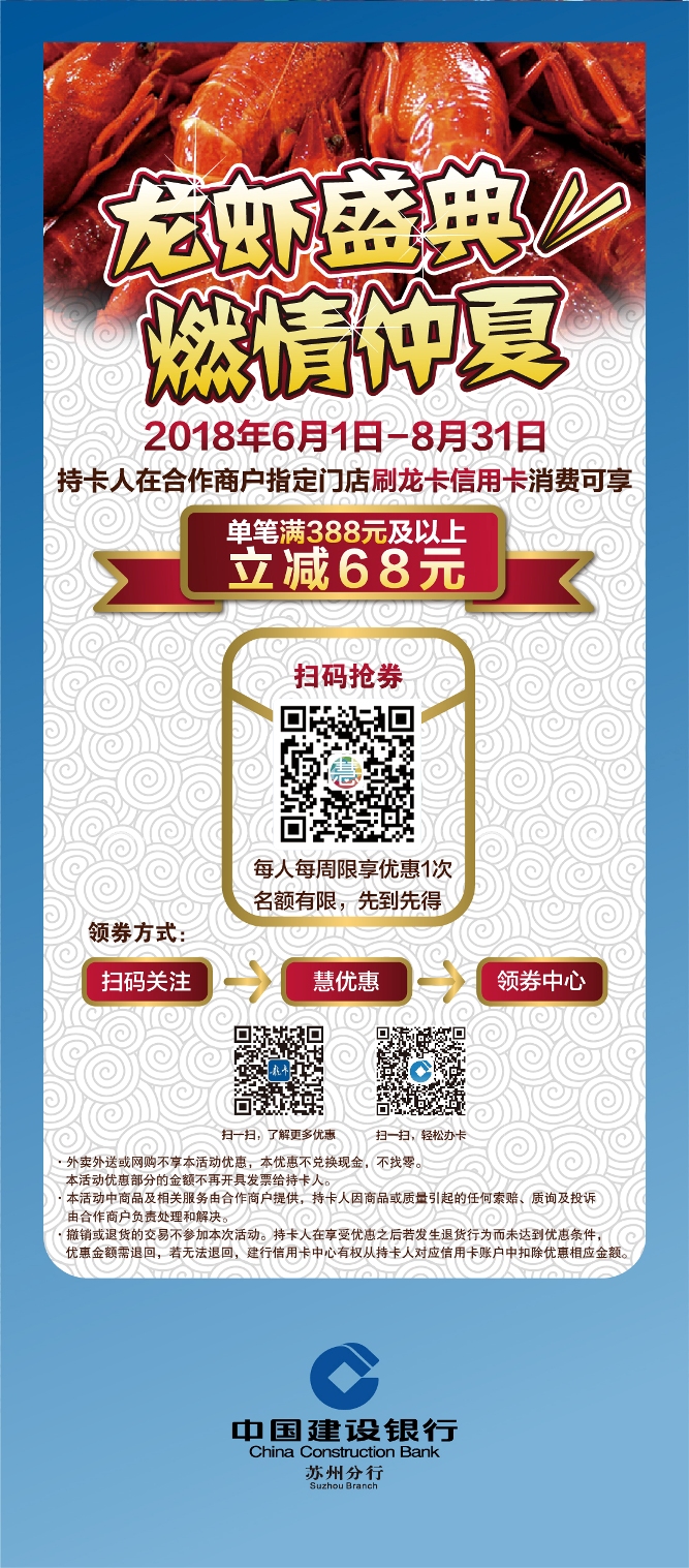 注:总行信用卡中心批复编号:322180080苏州分行:“龙虾盛典,燃情仲夏”活动(消费活动)